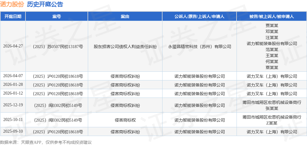 案号:(2025)苏0507民初13187号根据统计,近一年内以诺力智能装备股份有限公司为当事人的历史开庭公告有7则,其中案由为“侵害商标权纠纷”的公告以5则居首,其次为“侵害商标权”有1则,“股东损害公司债权人利益责任纠纷”有1则。历史开庭公告如下: