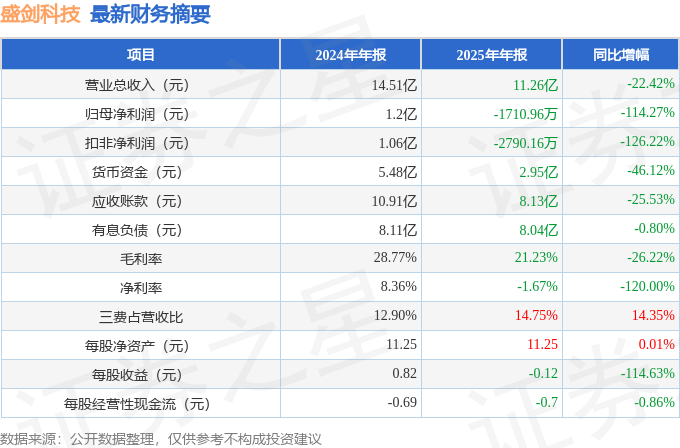 据证券之星公开数据整理,近期盛剑科技(603324)发布2025年年报。截至本报告期末,公司营业总收入11.26亿元,同比下降22.42%,归母净利润-1710.96万元,同比下降114.27%。按单季度数据看,第四季度营业总收入2.95亿元,同比下降35.56%,第四季度归母净利润-4781.68万元,同比下降268.22%。本报告期盛剑科技公司应收账款体量较大,当期应收账款占最新年报营业总收入比达72.21%。