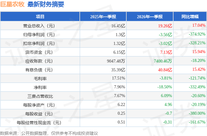 据证券之星公开数据整理,近期巨星农牧(603477)发布2026年一季报。截至本报告期末,公司营业总收入19.26亿元,同比上升17.04%,归母净利润-3.56亿元,同比下降374.92%。按单季度数据看,第一季度营业总收入19.26亿元,同比上升17.04%,第一季度归母净利润-3.56亿元,同比下降374.92%。本报告期巨星农牧公司应收账款体量较大,当期应收账款占最新年报归母净利润比达243.89%。