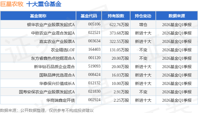 持有巨星农牧最多的基金为银华农业产业股票发起式A,目前规模为4.11亿元,最新净值1.2911(4月23日),较上一交易日下跌1.19%,近一年上涨0.35%。该基金现任基金经理为唐能。