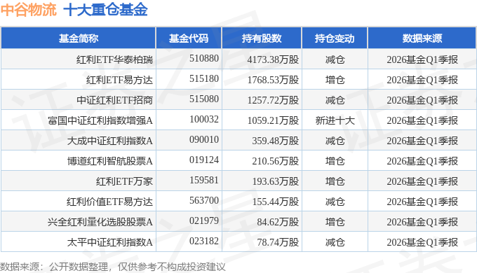 持有中谷物流最多的基金为红利ETF华泰柏瑞,目前规模为171.39亿元,最新净值3.289(4月23日),较上一交易日上涨0.69%,近一年上涨12.58%。该基金现任基金经理为柳军 李茜。