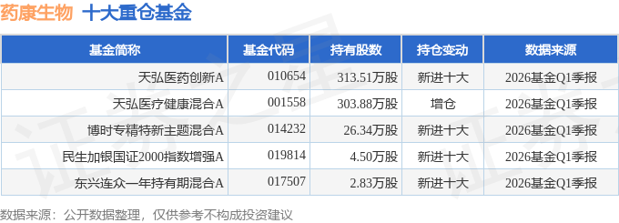 持有药康生物最多的基金为天弘医药创新A,目前规模为5.71亿元,最新净值1.0572(4月23日),较上一交易日下跌1.79%,近一年上涨38.3%。该基金现任基金经理为刘盟盟。