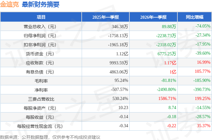 据证券之星公开数据整理,近期金迪克(688670)发布2026年一季报。截至本报告期末,公司营业总收入89.88万元,同比下降74.05%,归母净利润-2238.73万元,同比下降27.34%。按单季度数据看,第一季度营业总收入89.88万元,同比下降74.05%,第一季度归母净利润-2238.73万元,同比下降27.34%。本报告期金迪克三费占比上升明显,财务费用、销售费用和管理费用总和占总营收同比增幅达199.25%。