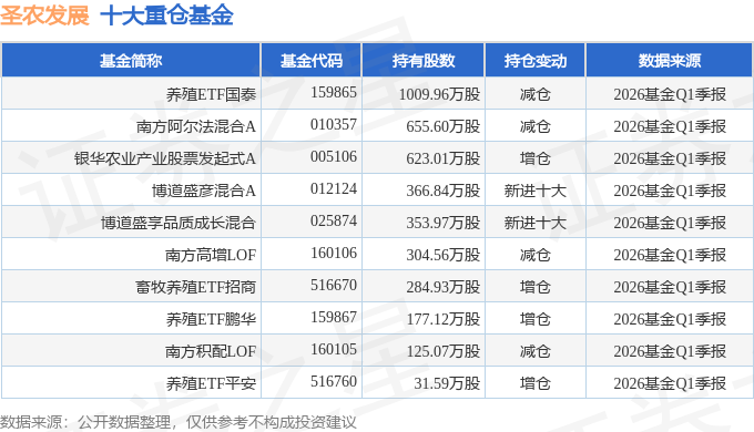 持有圣农发展最多的基金为养殖ETF国泰,目前规模为47.41亿元,最新净值0.6068(4月23日),较上一交易日下跌1.57%,近一年上涨3.41%。该基金现任基金经理为梁杏。