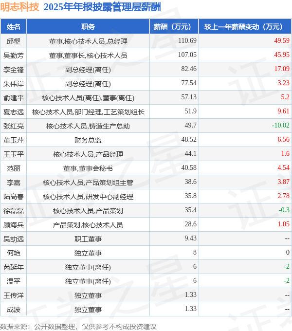 证券之星消息,明志科技发布2025年年报,数据显示:公司主营收入5.3亿元,同比减16.0%。归母净利润为7988.57万元,同比增20.42%。扣非净利润为4570.67万元,同比增32.88%。当年公司员工总数694人,同比减6.22%。人均薪酬21.6万元(注:"人均薪酬"根据定期报告中"应付职工薪酬"附注的本期增加值 / 员工总数计算而来),同比增5.8%。人均创收76.43万元,同比减10.43%。人均创利11.45万元,同比增27.75%。其中管理层薪酬总额为840.16万元,同比上一年增15.01%,薪酬最高的为董事,核心技术人员,总经理邱壑,薪酬110.69万元。