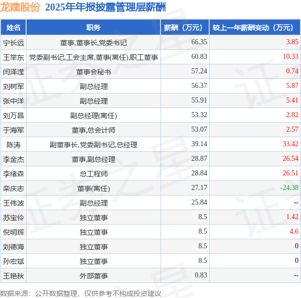 证券之星消息,龙建股份发布2025年年报,数据显示:公司主营收入176.13亿元,同比减3.7%。归母净利润为3.89亿元,同比减5.84%。扣非净利润为3.69亿元,同比减8.09%。当年公司员工总数5986人,同比减3.05%。人均薪酬17.99万元(注:"人均薪酬"根据定期报告中"应付职工薪酬"附注的本期增加值 / 员工总数计算而来),同比减4.23%。人均创收294.24万元,同比减0.68%。人均创利6.59万元,同比减4.92%。其中管理层薪酬总额为587.78万元,同比上一年减3.35%,薪酬最高的为董事,董事长,党委书记宁长远,薪酬66.35万元。