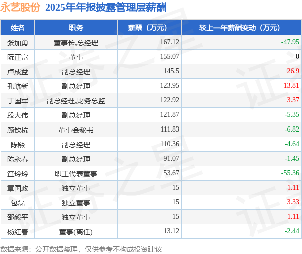 证券之星消息,永艺股份发布2025年年报,数据显示:公司主营收入48.82亿元,同比增2.79%。归母净利润为2.33亿元,同比减21.41%。扣非净利润为2.14亿元,同比减26.8%。当年公司员工总数7880人,同比减0.42%。人均薪酬11.04万元(注:"人均薪酬"根据定期报告中"应付职工薪酬"附注的本期增加值 / 员工总数计算而来),同比增8.88%。人均创收61.95万元,同比增3.22%。人均创利2.94万元,同比减22.96%。其中管理层薪酬总额为1261.48万元,同比上一年减13.55%,薪酬最高的为董事长,总经理张加勇,薪酬167.12万元。