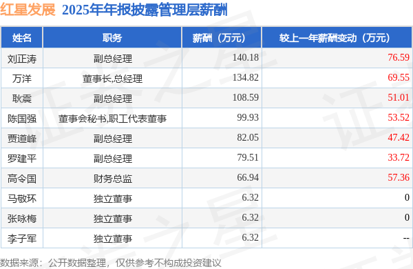 证券之星消息,红星发展发布2025年年报,数据显示:公司主营收入21.35亿元,同比减2.82%。归母净利润为9282.97万元,同比增4.21%。扣非净利润为9253.33万元,同比增23.09%。当年公司员工总数2554人,同比减7.43%。人均薪酬14.28万元(注:"人均薪酬"根据定期报告中"应付职工薪酬"附注的本期增加值 / 员工总数计算而来),同比增8.33%。人均创收83.6万元,同比增4.98%。人均创利4.61万元,同比增28.25%。其中管理层薪酬总额为731.0万元,同比上一年增92.43%,薪酬最高的为副总经理刘正涛,薪酬140.18万元。