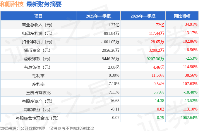 据证券之星公开数据整理,近期和顺科技(301237)发布2026年一季报。截至本报告期末,公司营业总收入1.72亿元,同比上升34.91%,归母净利润117.44万元,同比上升113.17%。按单季度数据看,第一季度营业总收入1.72亿元,同比上升34.91%,第一季度归母净利润117.44万元,同比上升113.17%。本报告期和顺科技盈利能力上升,毛利率同比增幅38.56%,净利率同比增幅107.63%。