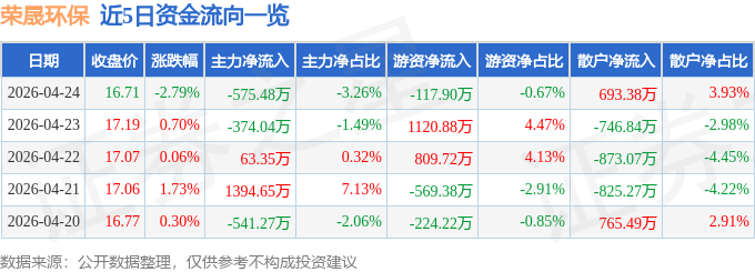 证券之星消息,截至2026年4月24日收盘,荣晟环保(603165)报收于16.71元,下跌2.79%,换手率3.27%,成交量10.46万手,成交额1.76亿元。