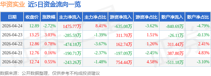 证券之星消息,截至2026年4月24日收盘,华资实业(600191)报收于12.89元,下跌2.72%,换手率2.86%,成交量13.86万手,成交额1.76亿元。