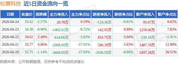 证券之星消息,截至2026年4月24日收盘,松霖科技(603992)报收于33.42元,下跌2.57%,换手率1.04%,成交量4.59万手,成交额1.54亿元。