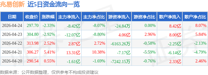 证券之星消息,截至2026年4月24日收盘,兆易创新(603986)报收于297.7元,下跌2.33%,换手率5.23%,成交量34.91万手,成交额104.36亿元。