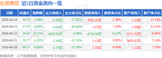 证券之星消息,截至2026年4月24日收盘,拓普集团(601689)报收于56.76元,下跌2.09%,换手率1.49%,成交量25.88万手,成交额14.71亿元。