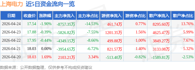 证券之星消息,截至2026年4月24日收盘,上海电力(600021)报收于17.54元,下跌1.9%,换手率1.22%,成交量34.3万手,成交额6.03亿元。