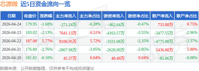 证券之星消息,截至2026年4月24日收盘,芯源微(688037)报收于179.95元,下跌1.68%,换手率2.65%,成交量5.35万手,成交额9.76亿元。