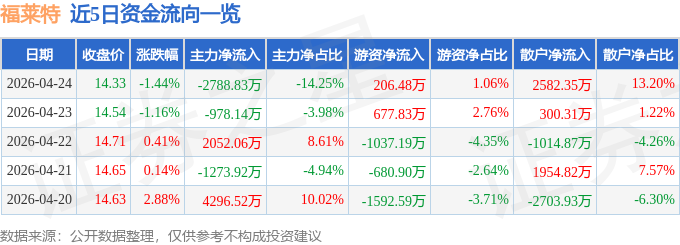 证券之星消息,截至2026年4月24日收盘,福莱特(601865)报收于14.33元,下跌1.44%,换手率0.72%,成交量13.6万手,成交额1.96亿元。