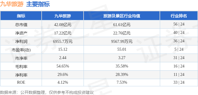 九华旅游2026年一季报显示,一季度公司主营收入2.35亿元,同比上升0.17%;归母净利润6955.7万元,同比上升1.31%;扣非净利润6762.05万元,同比上升1.1%;负债率12.94%,投资收益77.59万元,财务费用-3.81万元,毛利率54.65%。九华旅游(603199)主营业务:酒店业务、索道缆车业务、旅游客运业务及旅行社业务。