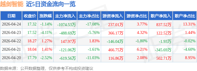 证券之星消息,截至2026年4月24日收盘,越剑智能(603095)报收于17.32元,下跌1.14%,换手率1.41%,成交量3.65万手,成交额6291.28万元。