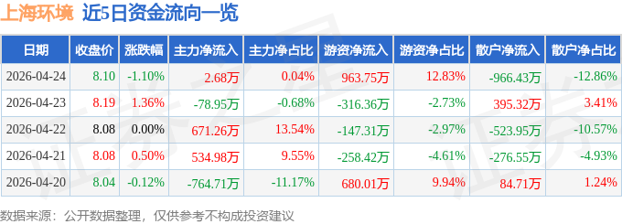 证券之星消息,截至2026年4月24日收盘,上海环境(601200)报收于8.1元,下跌1.1%,换手率0.69%,成交量9.26万手,成交额7513.57万元。
