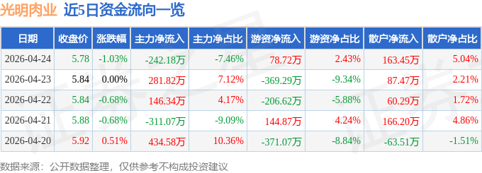 证券之星消息,截至2026年4月24日收盘,光明肉业(600073)报收于5.78元,下跌1.03%,换手率0.6%,成交量5.61万手,成交额3245.71万元。