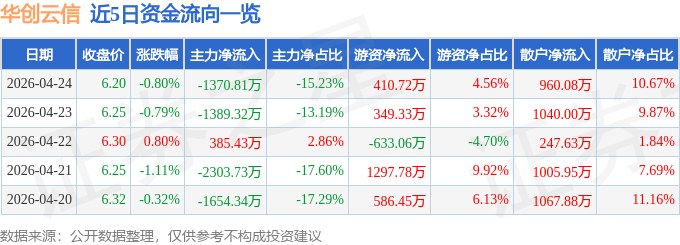 证券之星消息,截至2026年4月24日收盘,华创云信(600155)报收于6.2元,下跌0.8%,换手率0.66%,成交量14.5万手,成交额9000.64万元。