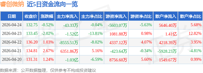证券之星消息,截至2026年4月24日收盘,睿创微纳(688002)报收于132.75元,下跌0.52%,换手率1.61%,成交量7.48万手,成交额9.95亿元。