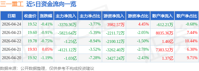证券之星消息,截至2026年4月24日收盘,三一重工(600031)报收于19.52元,下跌0.41%,换手率0.54%,成交量45.89万手,成交额8.95亿元。