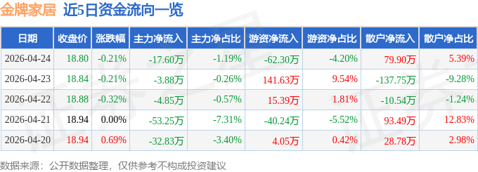 证券之星消息,截至2026年4月24日收盘,金牌家居(603180)报收于18.8元,下跌0.21%,换手率0.51%,成交量7940.0手,成交额1483.28万元。