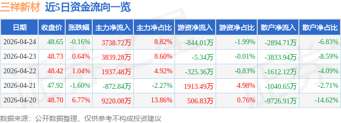 证券之星消息,截至2026年4月24日收盘,三祥新材(603663)报收于48.65元,下跌0.16%,换手率2.08%,成交量8.8万手,成交额4.24亿元。