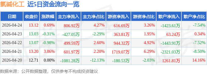 证券之星消息,截至2026年4月24日收盘,氯碱化工(600618)报收于13.12元,上涨0.69%,换手率1.93%,成交量14.47万手,成交额1.89亿元。