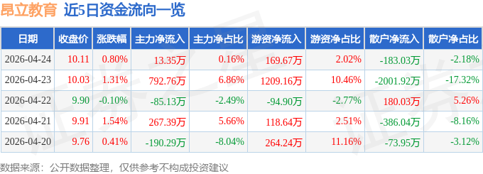 证券之星消息,截至2026年4月24日收盘,昂立教育(600661)报收于10.11元,上涨0.8%,换手率2.92%,成交量8.38万手,成交额8394.32万元。