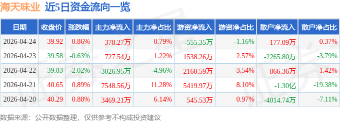 证券之星消息,截至2026年4月24日收盘,海天味业(603288)报收于39.92元,上涨0.86%,换手率0.22%,成交量11.98万手,成交额4.8亿元。