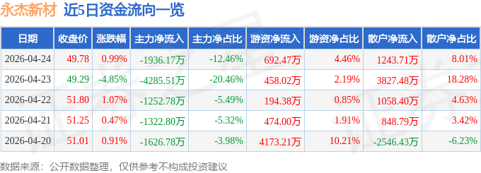 证券之星消息,截至2026年4月24日收盘,永杰新材(603271)报收于49.78元,上涨0.99%,换手率3.32%,成交量3.14万手,成交额1.55亿元。
