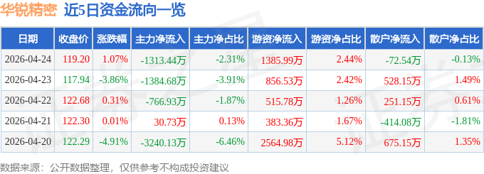 证券之星消息,截至2026年4月24日收盘,华锐精密(688059)报收于119.2元,上涨1.07%,换手率4.95%,成交量4.63万手,成交额5.69亿元。