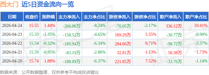 证券之星消息,截至2026年4月24日收盘,西大门(605155)报收于15.55元,上涨1.44%,换手率1.13%,成交量2.11万手,成交额3228.16万元。