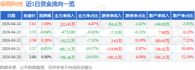 证券之星消息,截至2026年4月24日收盘,保税科技(600794)报收于3.61元,上涨1.69%,换手率1.2%,成交量14.46万手,成交额5200.24万元。