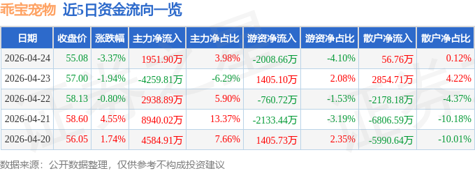 证券之星消息,截至2026年4月24日收盘,乖宝宠物(301498)报收于55.08元,下跌3.37%,换手率4.93%,成交量8.84万手,成交额4.9亿元。