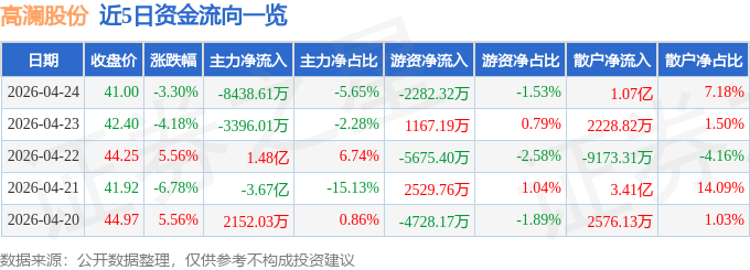 证券之星消息,截至2026年4月24日收盘,高澜股份(300499)报收于41.0元,下跌3.3%,换手率13.52%,成交量36.69万手,成交额14.94亿元。