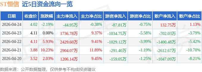 证券之星消息,截至2026年4月24日收盘,ST恒信(300081)报收于4.02元,下跌2.19%,换手率4.74%,成交量28.67万手,成交额1.17亿元。