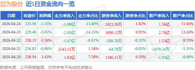 证券之星消息,截至2026年4月24日收盘,迈为股份(300751)报收于225.9元,下跌1.55%,换手率3.03%,成交量5.87万手,成交额13.34亿元。