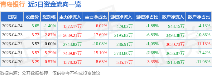 证券之星消息,截至2026年4月24日收盘,青岛银行(002948)报收于5.65元,下跌1.4%,换手率1.3%,成交量40.39万手,成交额2.28亿元。