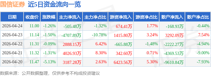 证券之星消息,截至2026年4月24日收盘,国信证券(002736)报收于11.0元,下跌1.26%,换手率0.36%,成交量34.66万手,成交额3.82亿元。