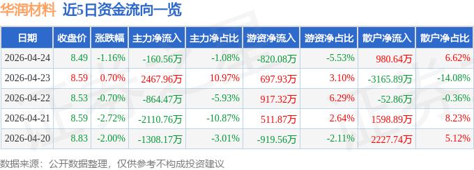 证券之星消息,截至2026年4月24日收盘,华润材料(301090)报收于8.49元,下跌1.16%,换手率1.18%,成交量17.35万手,成交额1.48亿元。