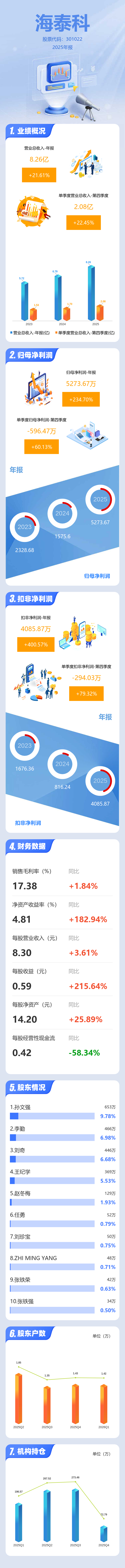 证券之星消息,海泰科2025年年报显示,当年度公司主营收入8.26亿元,同比上升21.61%;归母净利润5273.67万元,同比上升234.71%;扣非净利润4085.87万元,同比上升400.57%;其中2025年第四季度,公司单季度主营收入2.08亿元,同比上升22.45%;单季度归母净利润-596.47万元,同比上升60.13%;单季度扣非净利润-294.03万元,同比上升79.32%;负债率35.49%,投资收益351.16万元,财务费用-1225.85万元,毛利率17.38%。