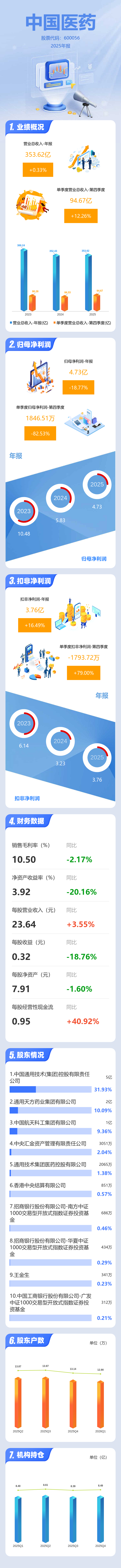 证券之星消息,中国医药2025年年报显示,当年度公司主营收入353.62亿元,同比上升0.34%;归母净利润4.73亿元,同比下降18.77%;扣非净利润3.76亿元,同比上升16.49%;其中2025年第四季度,公司单季度主营收入94.67亿元,同比上升12.26%;单季度归母净利润1846.51万元,同比下降82.53%;单季度扣非净利润-1793.72万元,同比上升79.01%;负债率61.04%,投资收益-6801.02万元,财务费用1.1亿元,毛利率10.5%。