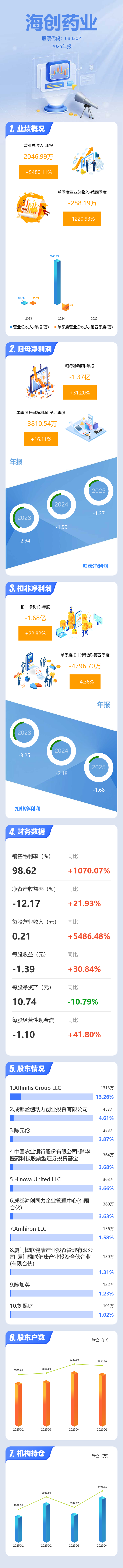 证券之星消息,海创药业2025年年报显示,当年度公司主营收入2046.99万元,同比上升5480.11%;归母净利润-1.37亿元,同比上升31.2%;扣非净利润-1.68亿元,同比上升22.82%;其中2025年第四季度,公司单季度主营收入-288.19万元,同比下降1220.93%;单季度归母净利润-3810.54万元,同比上升16.11%;单季度扣非净利润-4796.7万元,同比上升4.39%;负债率18.8%,投资收益518.41万元,财务费用-634.89万元,毛利率98.62%。