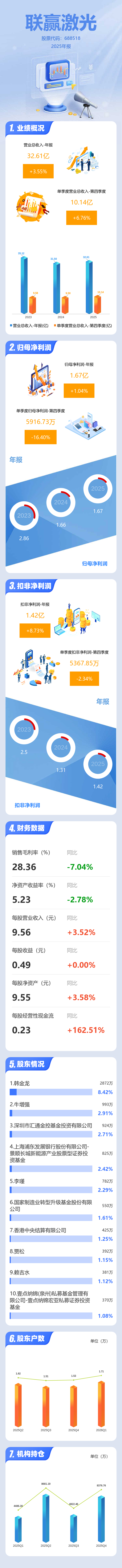 证券之星消息,联赢激光2025年年报显示,当年度公司主营收入32.61亿元,同比上升3.55%;归母净利润1.67亿元,同比上升1.05%;扣非净利润1.42亿元,同比上升8.74%;其中2025年第四季度,公司单季度主营收入10.14亿元,同比上升6.76%;单季度归母净利润5916.73万元,同比下降16.41%;单季度扣非净利润5367.85万元,同比下降2.34%;负债率60.15%,投资收益6.71万元,财务费用382.74万元,毛利率28.36%。