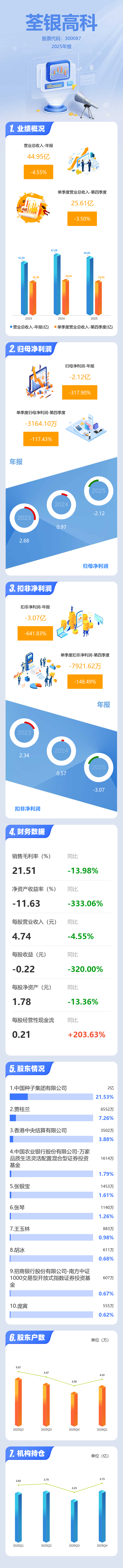 证券之星消息,荃银高科2025年年报显示,当年度公司主营收入44.95亿元,同比下降4.55%;归母净利润-2.12亿元,同比下降317.91%;扣非净利润-3.07亿元,同比下降641.84%;其中2025年第四季度,公司单季度主营收入25.61亿元,同比下降3.51%;单季度归母净利润-3164.1万元,同比下降117.44%;单季度扣非净利润-7921.62万元,同比下降148.5%;负债率69.0%,投资收益1994.34万元,财务费用6327.8万元,毛利率21.51%。