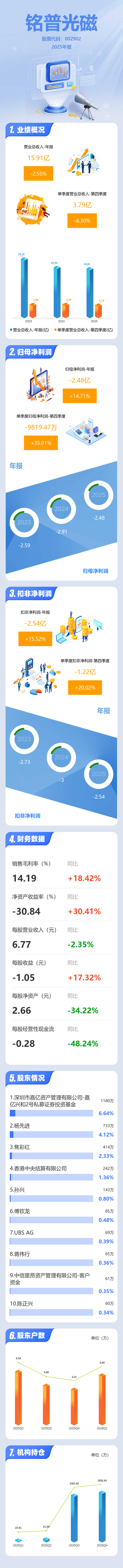 证券之星消息,铭普光磁2025年年报显示,当年度公司主营收入15.91亿元,同比下降2.55%;归母净利润-2.48亿元,同比上升14.72%;扣非净利润-2.54亿元,同比上升15.53%;其中2025年第四季度,公司单季度主营收入3.79亿元,同比下降6.31%;单季度归母净利润-9819.47万元,同比上升35.01%;单季度扣非净利润-1.22亿元,同比上升20.03%;负债率76.19%,投资收益503.41万元,财务费用3534.29万元,毛利率14.19%。